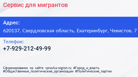 Сервис для мигрантов по адресу 620137, Свердловская область, Екатеринбург, Чекистов, 7 в дальнейшем Организация, размещена в следующих категориях: