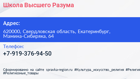 Школа Высшего Разума по адресу 620000, Свердловская область, Екатеринбург, Мамина-Сибиряка, 64 в дальнейшем Организация, размещена в следующих категориях: