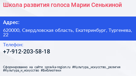 Школа развития голоса Марии Сенькиной по адресу 620000, Свердловская область, Екатеринбург, Тургенева, 22 в дальнейшем Организация, размещена в следующих категориях: