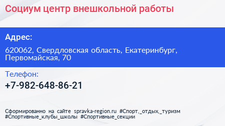 Социум, центр внешкольной работы по адресу 620062, Свердловская область, Екатеринбург, Первомайская, 70 в дальнейшем Организация, размещена в следующих категориях: