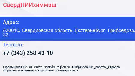 СвердНИИхиммаш по адресу 620010, Свердловская область, Екатеринбург, Грибоедова, 32 в дальнейшем Организация, размещена в следующих категориях: