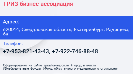 ТРИЗ, бизнес-ассоциация по адресу 620014, Свердловская область, Екатеринбург, Радищева, 6а в дальнейшем Организация, размещена в следующих категориях: