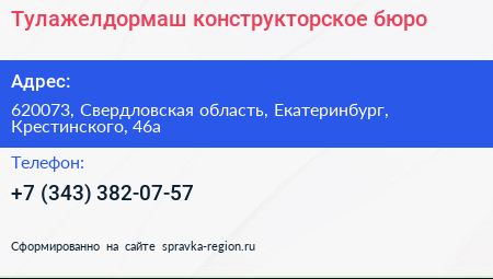 Тулажелдормаш, конструкторское бюро по адресу 620073, Свердловская область, Екатеринбург, Крестинского, 46а в дальнейшем Организация, размещена в следующих категориях: