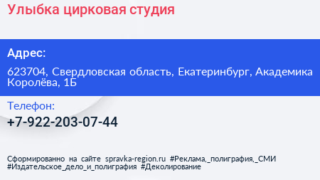 Улыбка, цирковая студия по адресу 623704, Свердловская область, Екатеринбург, Академика Королёва, 1Б в дальнейшем Организация, размещена в следующих категориях: