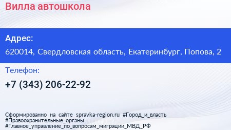 Вилла, автошкола по адресу 620014, Свердловская область, Екатеринбург, Попова, 2 в дальнейшем Организация, размещена в следующих категориях: