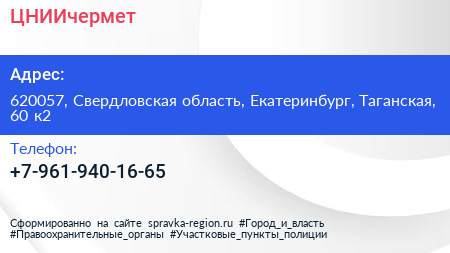 ЦНИИчермет по адресу 620057, Свердловская область, Екатеринбург, Таганская, 60 к2 в дальнейшем Организация, размещена в следующих категориях: