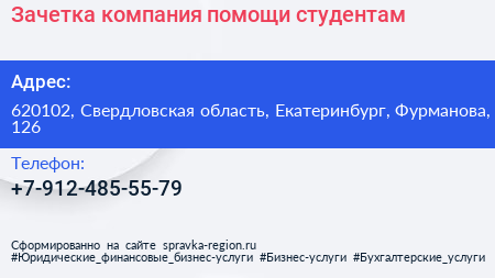Зачетка, компания помощи студентам по адресу 620102, Свердловская область, Екатеринбург, Фурманова, 126 в дальнейшем Организация, размещена в следующих категориях: