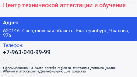 Центр технической аттестации и обучения по адресу 620146, Свердловская область, Екатеринбург, Чкалова, 97а в дальнейшем Организация, размещена в следующих категориях: