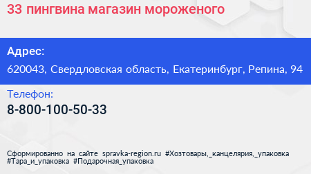 33 пингвина, магазин мороженого по адресу 620043, Свердловская область, Екатеринбург, Репина, 94 в дальнейшем Организация, размещена в следующих категориях: