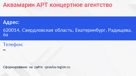 Аквамарин-АРТ, концертное агентство по адресу 620014, Свердловская область, Екатеринбург, Радищева, 6а в дальнейшем Организация, размещена в следующих категориях: