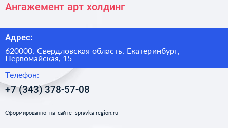 Ангажемент, арт-холдинг по адресу 620000, Свердловская область, Екатеринбург, Первомайская, 15 в дальнейшем Организация, размещена в следующих категориях:
