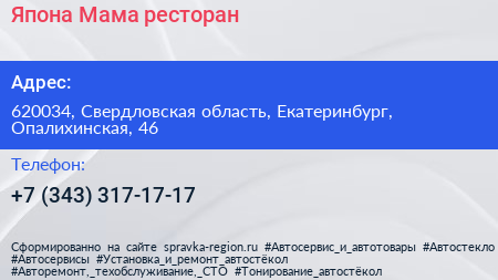 Япона Мама, ресторан по адресу 620034, Свердловская область, Екатеринбург, Опалихинская, 46 в дальнейшем Организация, размещена в следующих категориях: