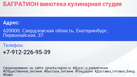 БАГРАТИОН, винотека-кулинарная студия по адресу 620000, Свердловская область, Екатеринбург, Первомайская, 37 в дальнейшем Организация, размещена в следующих категориях:
