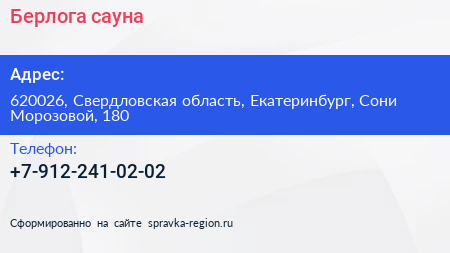 Берлога, сауна по адресу 620026, Свердловская область, Екатеринбург, Сони Морозовой, 180 в дальнейшем Организация, размещена в следующих категориях: