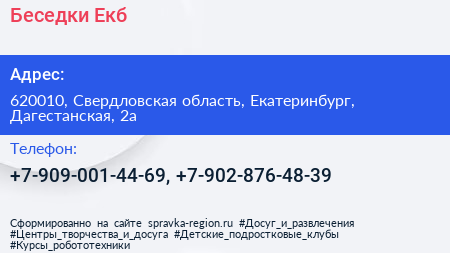 Беседки-Екб по адресу 620010, Свердловская область, Екатеринбург, Дагестанская, 2а в дальнейшем Организация, размещена в следующих категориях: