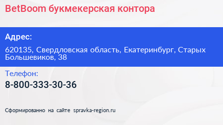 BetBoom, букмекерская контора по адресу 620135, Свердловская область, Екатеринбург, Старых Большевиков, 38 в дальнейшем Организация, размещена в следующих категориях: