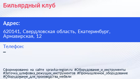 Бильярдный клуб по адресу 620141, Свердловская область, Екатеринбург, Армавирская, 12 в дальнейшем Организация, размещена в следующих категориях: