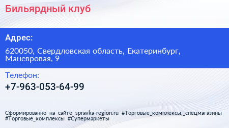 Бильярдный клуб по адресу 620050, Свердловская область, Екатеринбург, Маневровая, 9 в дальнейшем Организация, размещена в следующих категориях:
