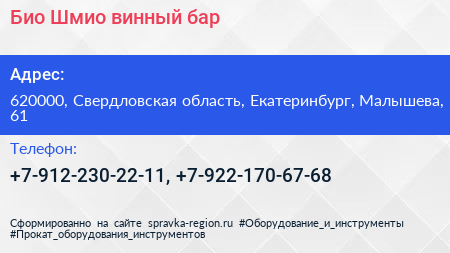 Био Шмио, винный бар по адресу 620000, Свердловская область, Екатеринбург, Малышева, 61 в дальнейшем Организация, размещена в следующих категориях: