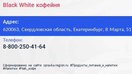 Black & White, кофейня по адресу 620063, Свердловская область, Екатеринбург, 8 Марта, 51 в дальнейшем Организация, размещена в следующих категориях:
