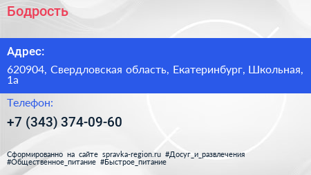 Бодрость по адресу 620904, Свердловская область, Екатеринбург, Школьная, 1а в дальнейшем Организация, размещена в следующих категориях: