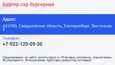 Бургер, сэр!, бургерная по адресу 623700, Свердловская область, Екатеринбург, Восточная, 9 в дальнейшем Организация, размещена в следующих категориях: