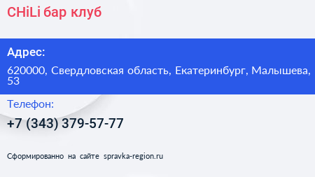 CHiLi, бар-клуб по адресу 620000, Свердловская область, Екатеринбург, Малышева, 53 в дальнейшем Организация, размещена в следующих категориях: