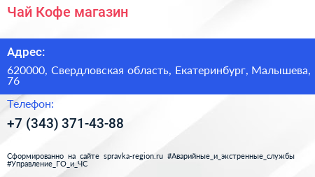 Чай & Кофе, магазин по адресу 620000, Свердловская область, Екатеринбург, Малышева, 76 в дальнейшем Организация, размещена в следующих категориях: