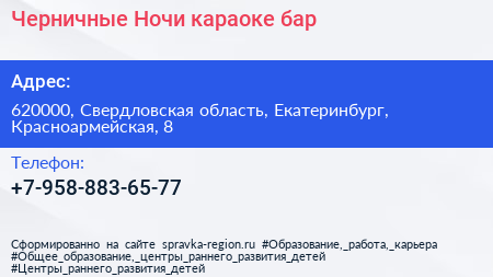 Черничные Ночи, караоке-бар по адресу 620000, Свердловская область, Екатеринбург, Красноармейская, 8 в дальнейшем Организация, размещена в следующих категориях: