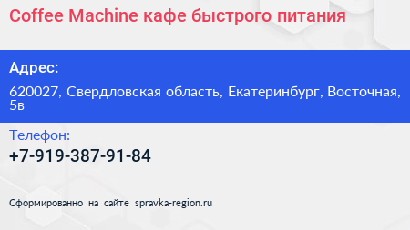 Coffee Machine, кафе быстрого питания по адресу 620027, Свердловская область, Екатеринбург, Восточная, 5в в дальнейшем Организация, размещена в следующих категориях: