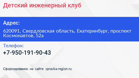 Детский инженерный клуб по адресу 620091, Свердловская область, Екатеринбург, проспект Космонавтов, 52а в дальнейшем Организация, размещена в следующих категориях: