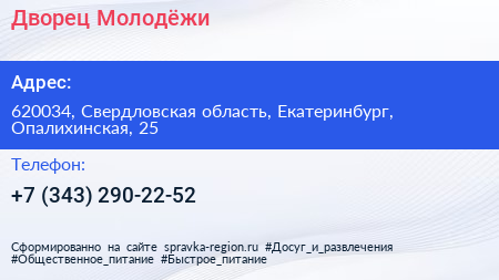 Дворец Молодёжи по адресу 620034, Свердловская область, Екатеринбург, Опалихинская, 25 в дальнейшем Организация, размещена в следующих категориях: