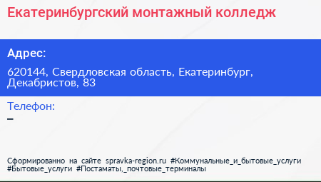 Екатеринбургский монтажный колледж по адресу 620144, Свердловская область, Екатеринбург, Декабристов, 83 в дальнейшем Организация, размещена в следующих категориях: