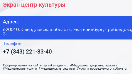 Экран, центр культуры по адресу 620010, Свердловская область, Екатеринбург, Грибоедова, 3 в дальнейшем Организация, размещена в следующих категориях: