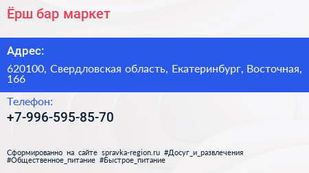 Ёрш, бар-маркет по адресу 620100, Свердловская область, Екатеринбург, Восточная, 166 в дальнейшем Организация, размещена в следующих категориях: