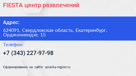 FIESTA, центр развлечений по адресу 624091, Свердловская область, Екатеринбург, Орджоникидзе, 15 в дальнейшем Организация, размещена в следующих категориях: