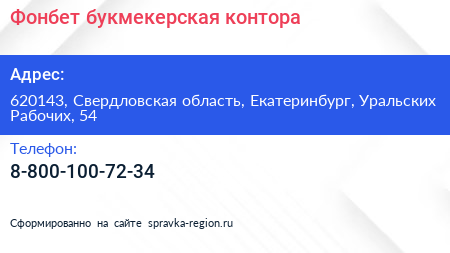 Фонбет, букмекерская контора по адресу 620143, Свердловская область, Екатеринбург, Уральских Рабочих, 54 в дальнейшем Организация, размещена в следующих категориях:
