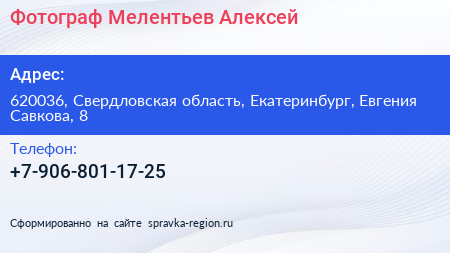 Фотограф Мелентьев Алексей по адресу 620036, Свердловская область, Екатеринбург, Евгения Савкова, 8 в дальнейшем Организация, размещена в следующих категориях: