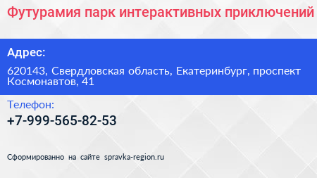 Футурамия, парк интерактивных приключений по адресу 620143, Свердловская область, Екатеринбург, проспект Космонавтов, 41 в дальнейшем Организация, размещена в следующих категориях:
