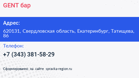 GENT, бар по адресу 620131, Свердловская область, Екатеринбург, Татищева, 86 в дальнейшем Организация, размещена в следующих категориях: