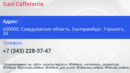Gavi Caffeterria по адресу 620000, Свердловская область, Екатеринбург, Горького, 26 в дальнейшем Организация, размещена в следующих категориях: