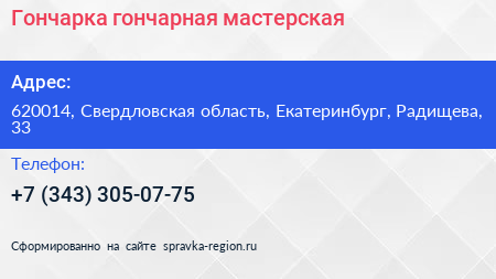 Гончарка, гончарная мастерская по адресу 620014, Свердловская область, Екатеринбург, Радищева, 33 в дальнейшем Организация, размещена в следующих категориях: