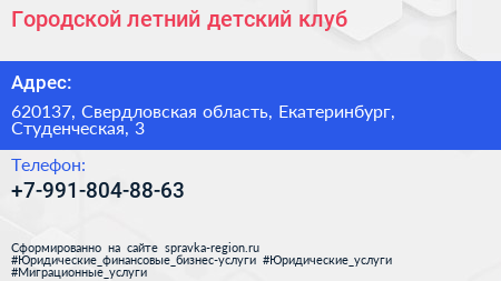 Городской летний детский клуб по адресу 620137, Свердловская область, Екатеринбург, Студенческая, 3 в дальнейшем Организация, размещена в следующих категориях: