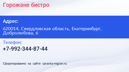 Горожане, бистро по адресу 620014, Свердловская область, Екатеринбург, Добролюбова, 6 в дальнейшем Организация, размещена в следующих категориях: