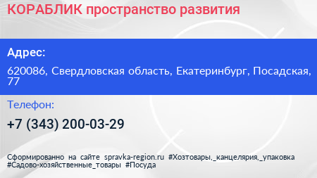 КОРАБЛИК, пространство развития по адресу 620086, Свердловская область, Екатеринбург, Посадская, 77 в дальнейшем Организация, размещена в следующих категориях:
