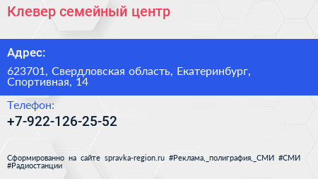 Клевер, семейный центр по адресу 623701, Свердловская область, Екатеринбург, Спортивная, 14 в дальнейшем Организация, размещена в следующих категориях: