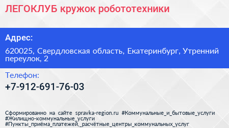 ЛЕГОКЛУБ, кружок робототехники по адресу 620025, Свердловская область, Екатеринбург, Утренний переулок, 2 в дальнейшем Организация, размещена в следующих категориях: