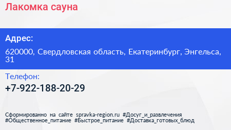 Лакомка, сауна по адресу 620000, Свердловская область, Екатеринбург, Энгельса, 31 в дальнейшем Организация, размещена в следующих категориях: