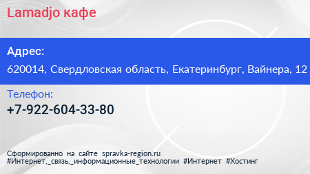 Lamadjo, кафе по адресу 620014, Свердловская область, Екатеринбург, Вайнера, 12 в дальнейшем Организация, размещена в следующих категориях: