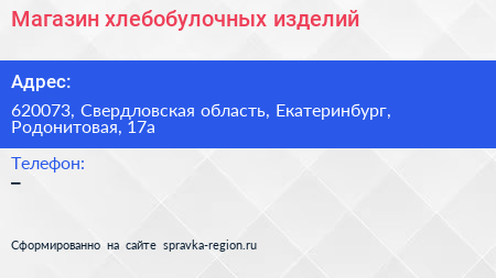 Магазин хлебобулочных изделий по адресу 620073, Свердловская область, Екатеринбург, Родонитовая, 17а в дальнейшем Организация, размещена в следующих категориях: